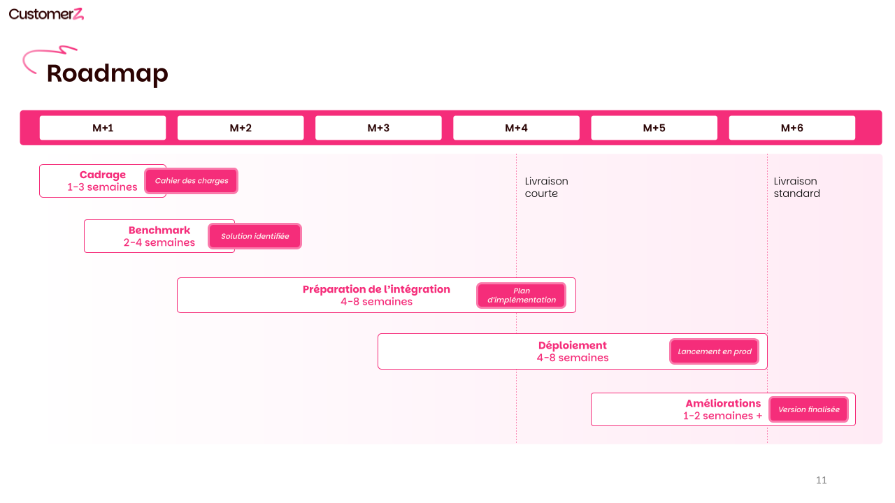En moyenne 10 à 13 semaines, du cadrage au premier jour de déploiement. Cela dépend surtout du niveau de maturité CS et de la disponibilité des parties prenantes.